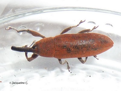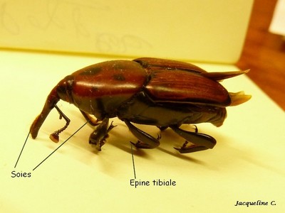 Charançon du palmier, mâle (soies sur le rostre et les tibias)